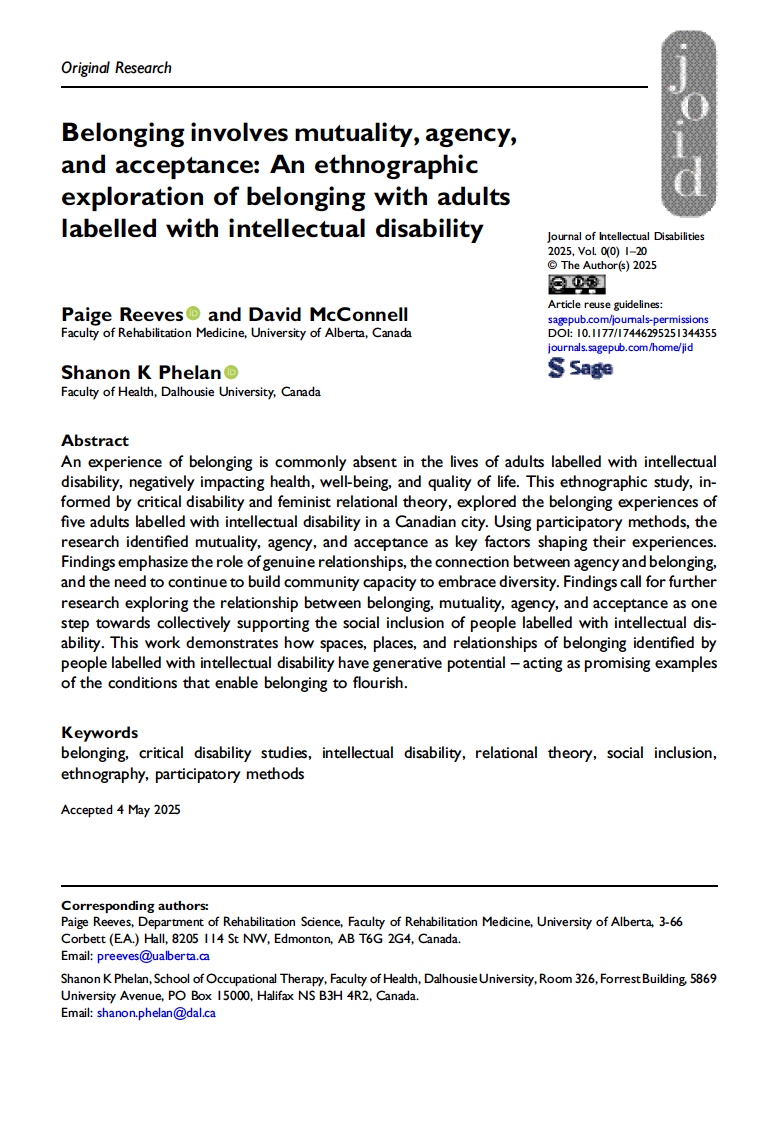 The work has been presented at multiple local, national, and international conferences including TASH, the Nordic Network of Disability Research, Alberta Council of Disability Services, and the Canadian Association of Occupational Therapists Conference